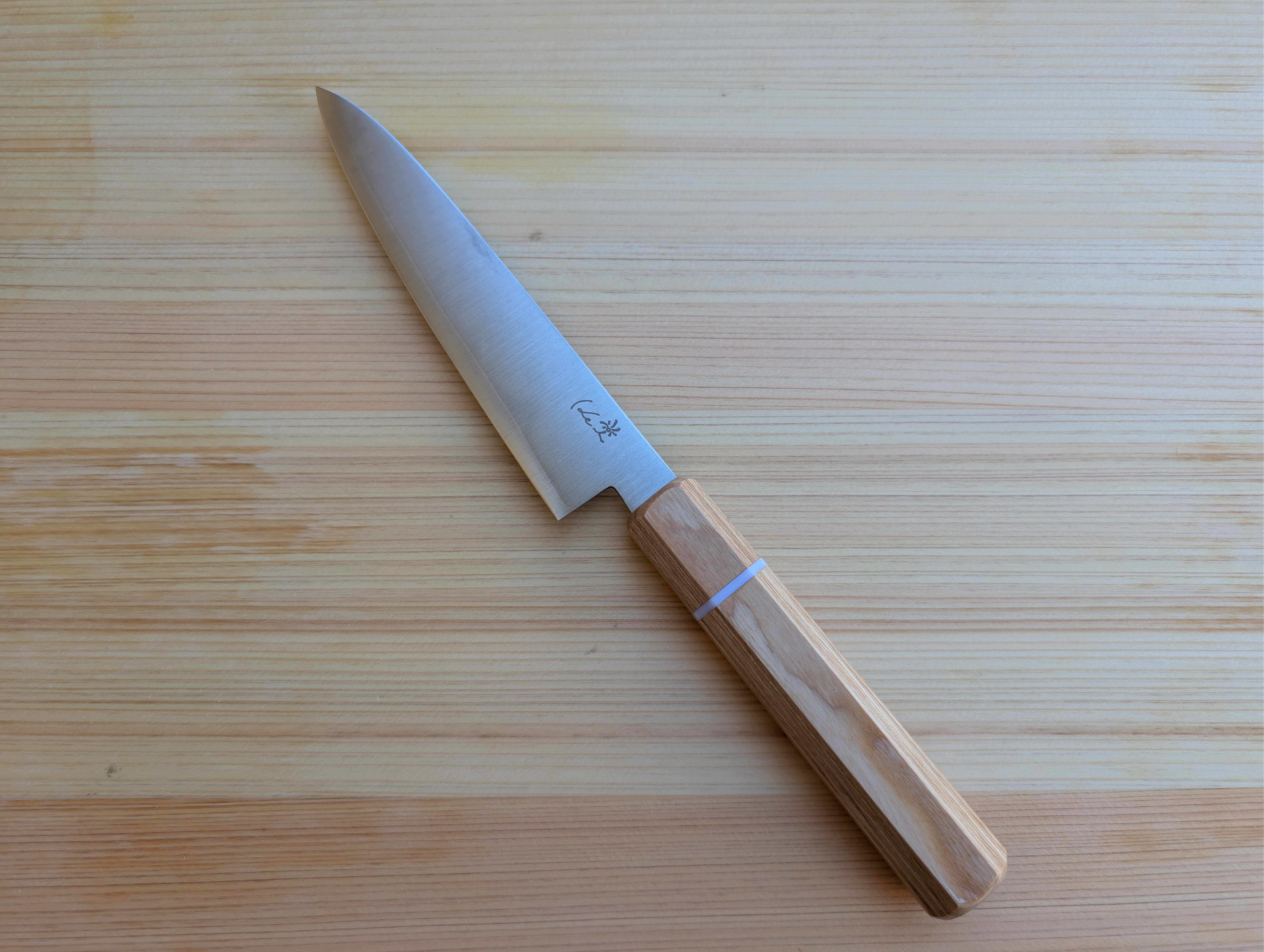 Seki City is located in Gifu prefecture ,north of Nagoya.This area has been a center of KATANA sword production since the 13th century ,but is now better know for its production of stainless type knives, high-quality pocket knives, scissors, and nail clippers. The handle on this knife is beautifully constructed with magnolia wood handle and a white spacer. The combination of the handle and clean look on the blade is a great pairing. The blade geometry leans middle weight. It is constructed out of VG10 steel which is a stainless steel that is highly resistant to corrosion (rust) and good edge retention (depending on the forging process). My first Japanese knife was made out of VG10 and it's still heavily in use, so I have no complaints. The finish on the knife is clean, with vertical brushing and a smooth kasumi finish closer to the edge.